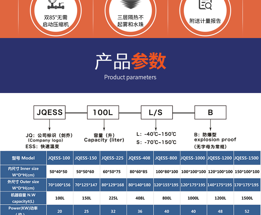 產(chǎn)品型號:JQESS-100L 品牌:劍 喬 用途:快速溫變試驗箱應用于,試驗各種產(chǎn)品及材料耐熱,耐寒,耐高溫,耐濕性能。適合電子,光伏組件,電器,食品,車輛,金屬,化學,建材等工廠,科研單位,院校之用。