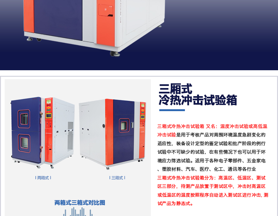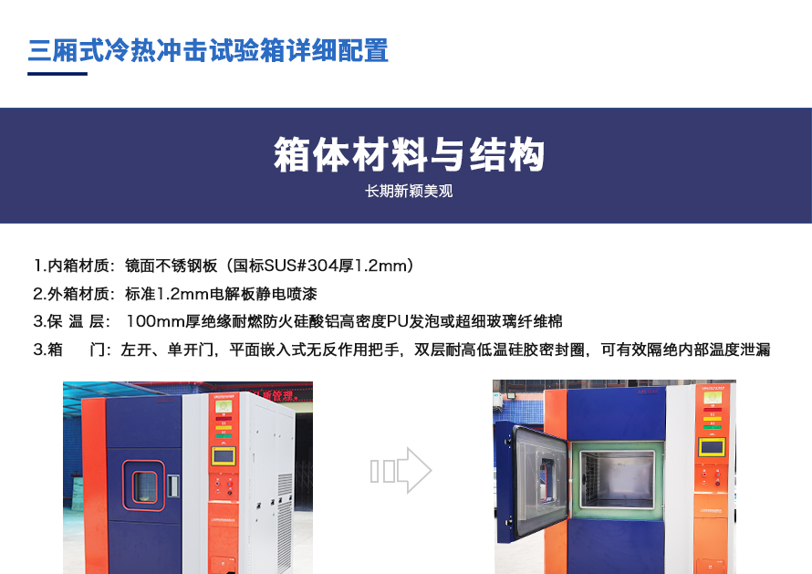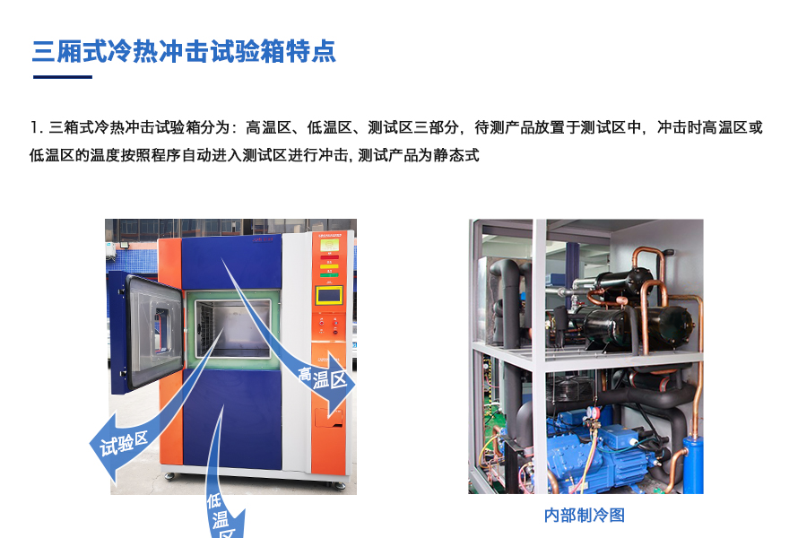 產品型號:JQTS3-408 品牌:劍 喬 用途:用途:三箱式冷熱沖擊試驗箱又名溫度沖擊試驗或高低溫沖擊試驗是用于考核產品對周圍環境溫度急劇變化的適應性,裝備設計定型的鑒定試驗和批產階段的例行試驗中不可缺少的試驗